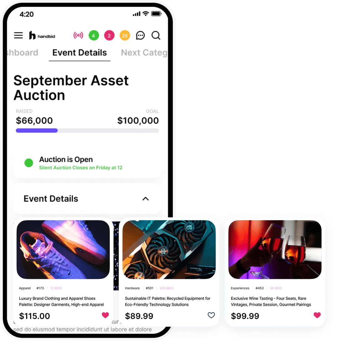 - Livestreaming via the Handbid app and event website
